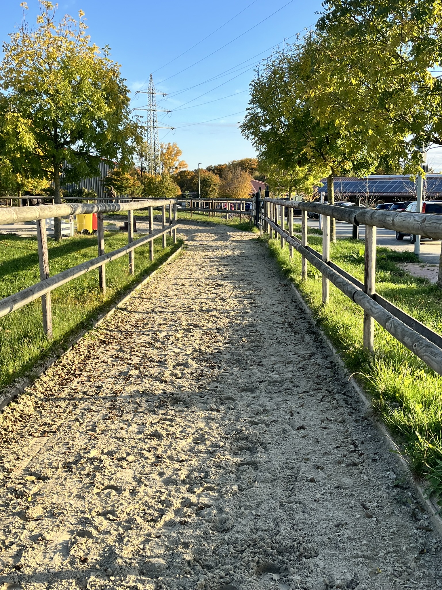 Der Clou: ringsrum gibt es eine Rennbahn! Auch diese wird noch eingezäunt und dann kann man Runde um Runde auf gutem Boden und auf langer Linie sein Pferd bewegen - sei es im Schritt, Trab oder Galopp, volle Kraft voraus! Natürlich immer unter Rücksicht auf andere Reiter auf den Plätzen.